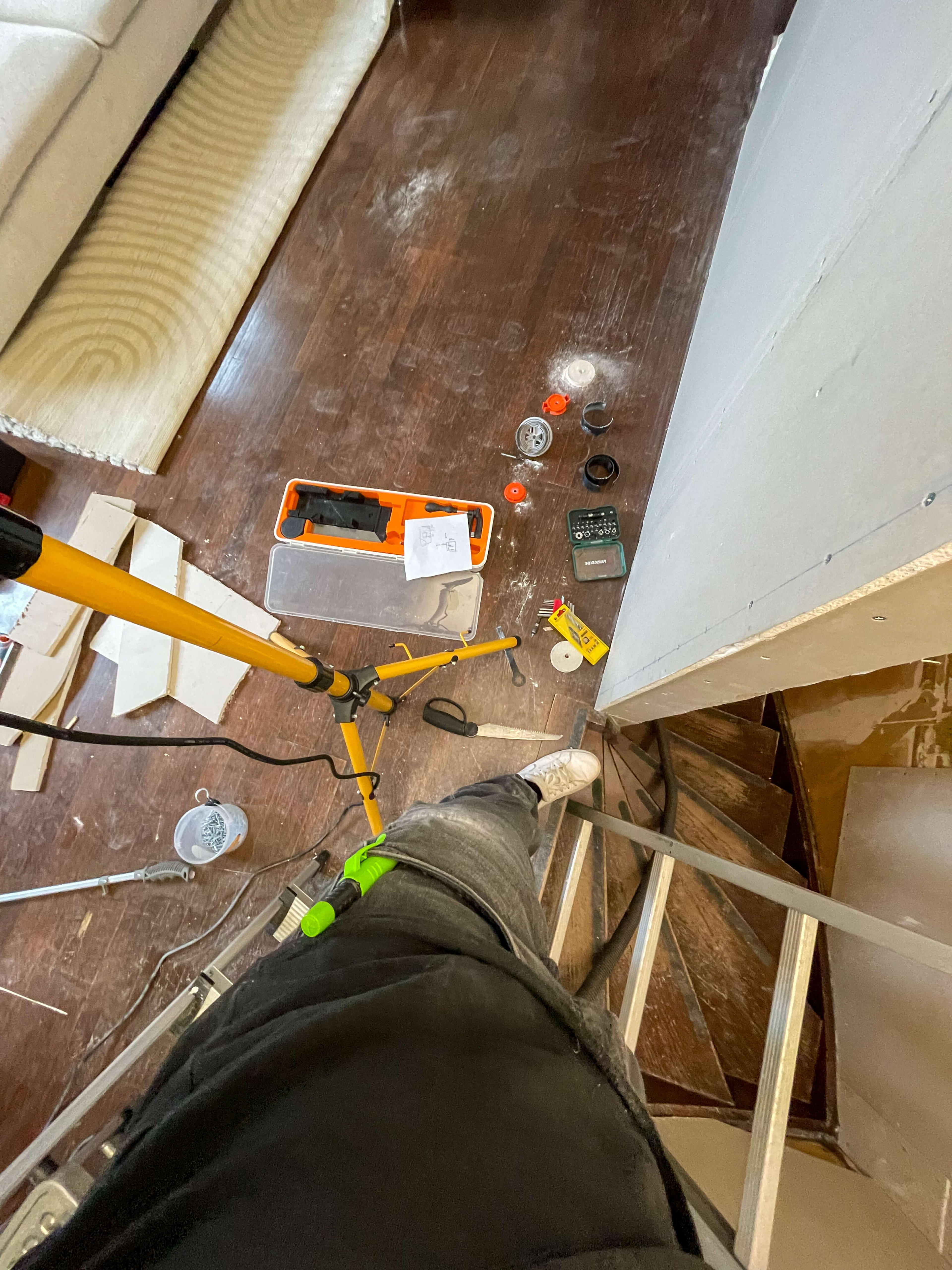 An overhead shot capturing a construction scene with tools scattered on the floor, a ladder leading down the staircase, and a bright work light illuminating the space, showcasing the process of drywall installation and renovation.